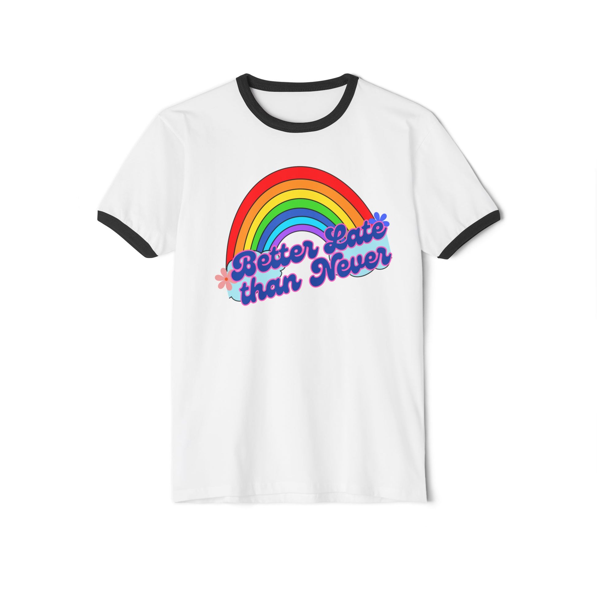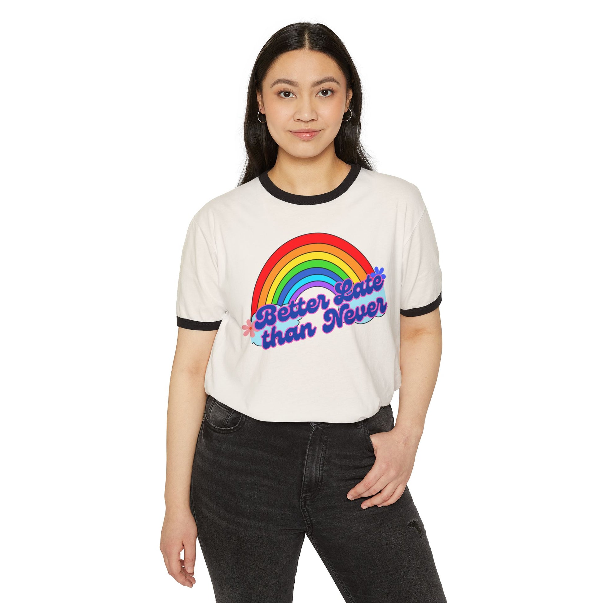 Rainbow Ringer T-Shirt | Better Late Than Never | Unisex Cotton Tee for Celebrations, Gifts, Pride Month, Casual Wear, Fun Events